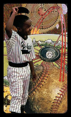 Baseball is a game played on a unique field which is cooporatively shared by both teams. The four bases are connected to the four-ness of the world (seasons, elements, etc.) and this four-ness is repeated in the labyrinth above the boy's head. Below is the baseball "diamond", symbolic of the skills we work to perfect.