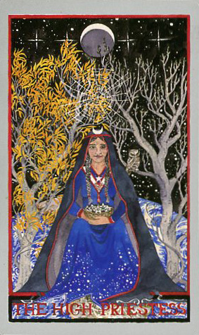 I imagine that if the Rider-Waite and Motherpeace decks could have a baby, The Wheel of Change would be their Solstice child--well grounded in the past, but a strong, new individual. The imagery is very diverse, drawing on different cultural and geographical sources, as well as historic and present day symbols. Both genders and different ages are represented. Genetti takes us from an ancient Egyptian tomb to a modern laboratory. We spiral around the earth from Australia to the North Arctic Circle and out into the Universe. Her work reveals a philosophy which reflects concern for the environment, pleasure in diversity, and a reverence for the interconnected web of life. Genetti repeatedly introduces Goddess lore and themes sacred to those on a Nature-oriented path. For me, she fixes some of the problems I've had with other decks--for example, it bothers me when the High Priestess is young. I believe the title of High Priestess would come with time and experience, not just youthful aptitude. I want to climb into The Wheel's High Priestess card and sit with my head on this crone's knee.