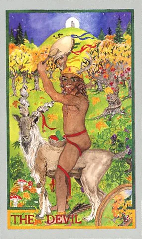 Autumn is the season of harvest, and yet, as the bounty of produce is stored and processed, the darkness of the season increases and the cold creeps in. These are the natural processes that the Devil responds to; the extremes of the year are both represented in the fall: its joy and sorrow, strength and fear. The Devil symbolizes our attachment to the emotional experience of extremes. As a culture we are drawn to the darkest tales of human depravity for the emotional ride they give us. We are also drawn to the storybook fairy-tale happy ending as the other extreme of this. The Devil is the fulfillment of our desires, the attachment we have to our lives, and the drowning in the pain and pleasure of the senses. He revels in the experience of drunkenness with the vine and the mushroom. He loves the sexual experience and will be just as inquisitive there, for it is his desire to experience the full range of human possibility.